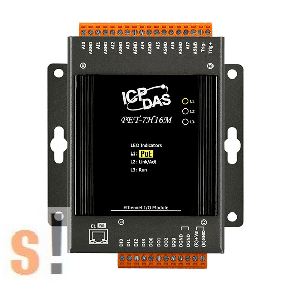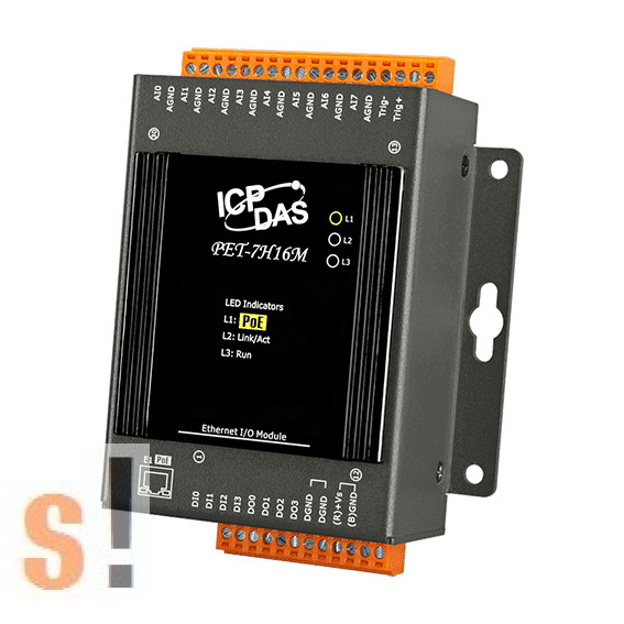A PET-7H16M egy nagy sebességű adatgyűjtő eszköz, beépített Ethernet kommunikációs porttal a hálózaton történő adatátvitelhez, nyolc nagy sebességű 16 bites egyoldalas analóg bemenettel (200 KHz mintavétel és tartás 8 csatornára), 4 csatornás digitális bemenettel és 4 csatornás digitális kimenettel. Programozható bemeneti tartományt biztosít minden analóg csatornán (±5 V és ±10 V), a digitális kimenet rövidzárlat-védelemmel és túlterhelés-védelemmel állítható be. A 4 csatornás alacsony sebességű DI számlálók és az 1 csatornás nagy sebességű számláló számlálási értéke az ADC mintavételi idővel szinkronban van rögzítve.