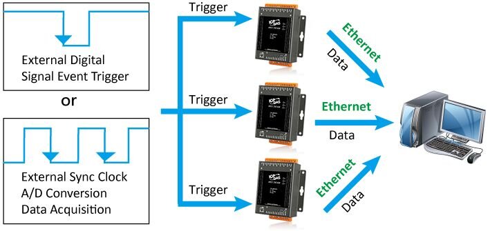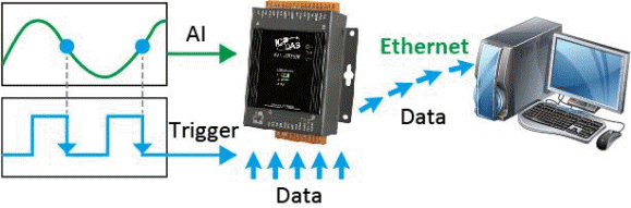 Az előző 1–4 pontban felsorolt funkciók mind az A/D nagysebességű adatgyűjtéssel, adatátvitellel és trigger móddal kapcsolatosak. Az analóg bemenet nagysebességű adatgyűjtése mellett más digitális bemenetek/digitális kimenetek visszaolvasása és számláló bemenetek is egyidejűleg olvashatók, és ezek az adatgyűjtési adatok az analóg bemeneti mintavételi adatokkal együtt átvihetők a gazdaszámítógépre. A szinkron bemeneti adatgyűjtés Ethernet-adatkockájába különböző bemeneti típusok rugalmasan definiálhatók. A szinkron bemeneti adatgyűjtésnél a mintavételi frekvencia legfeljebb 2 kHz lehet. A szinkron bemeneti adatgyűjtés átviteli csomagja a felhasználó által definiált adatkockákkal beágyazva van az Ethernet-kockába. Az alábbiakban néhány példát mutatunk be.