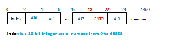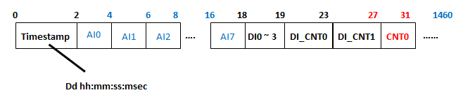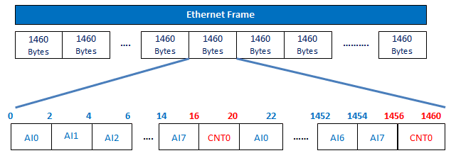 3. A következő felhasználó által definiált keret egy időbélyegző fejlécből, egy 8 csatornás AI értékből, egy 4 csatornás DI értékből, egy 2 csatornás alacsony sebességű számláló értékből és egy 1 csatornás nagy sebességű számláló értékből áll.